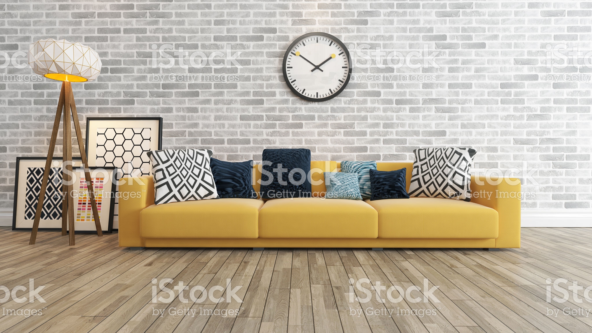 living room or saloon interior design with big wall yellow seat or sofa and picture frames watch 3d rendering